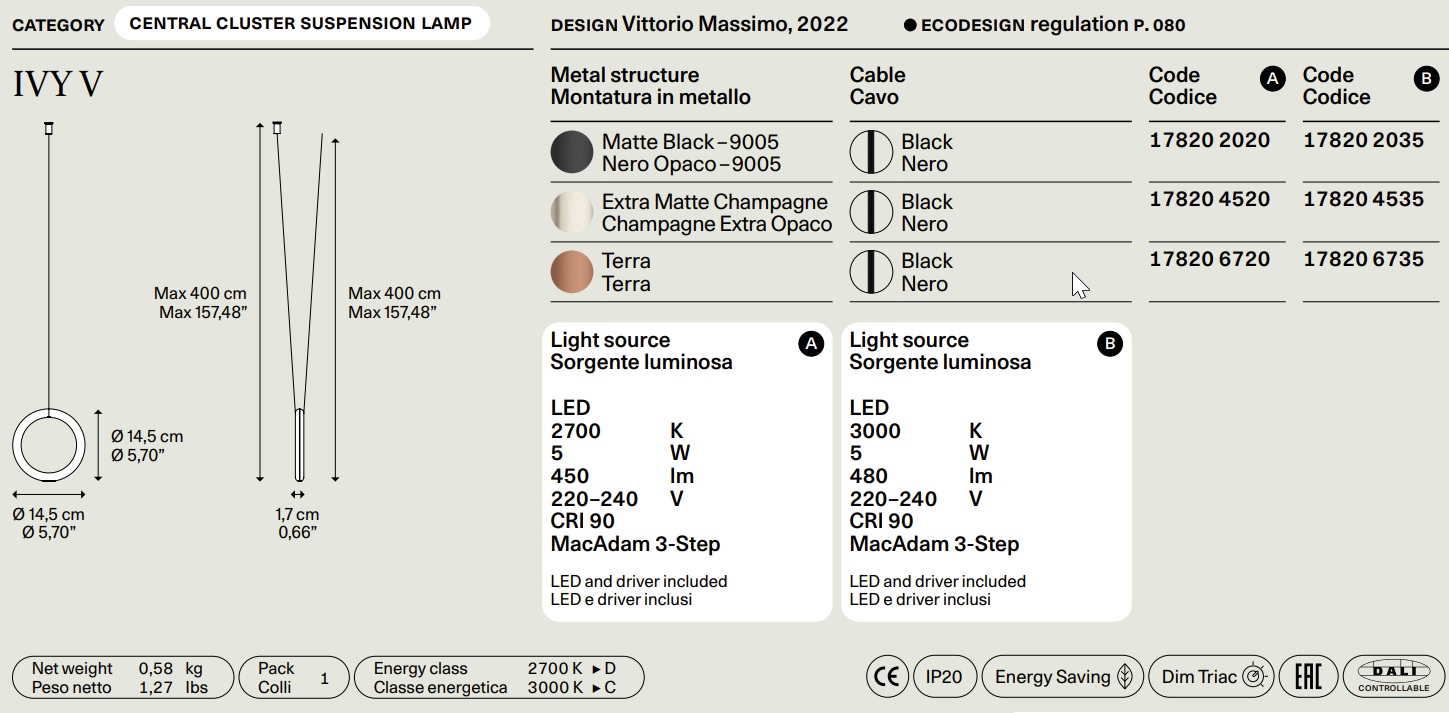 Die IVY V Pendelleuchte wurde von dem Hersteller Lodes in Italien entworfen und hergestellt. Diese minimalistische LED-Pendelleuchte ist ein richtiges Beleuchtungsobjekt. Das LED-Modul im Ring die mit der Kabelaufhängung verbunden ist, wird mit Niedervolt Strom versorgt. Diese Leuchte ist flexibel mit ihrer Befestigungslösung. Sie haben die Möglichkeit sie einzeln oder aber mit einer doppelten Befestigung am Kabel zu hängen. Dadurch hat sie die Möglichkeit sich von der Deckenableitung zu lösen. Diese Hängeleuchte muss unter Zubehör mit einem Baldachin Single oder Cluster zusammen bestellt werden. Die maximale Kabellänge beträgt 4 Meter. Sie können diese Leuchte in drei verschiedenen Farben bestellen. Die Elara können Sie in zwei verschiedenen Warmtönen bestellen. Sei es das hellere Warme Licht von 3000 Kelvin, oder aber das etwas wärmere Warm weißen Licht von 2700 Kelvin. Die IVY lässt sich Problemlos über einen Phasenanschnittsdimmer oder über einem Casambi Modul, sowie Dali Modul anstuern und dimmen. Das passende Zubehör finden Sie unten. Sollten Sie noch Fragen oder Anregungen haben, können Sie uns gerne kontaktieren. Wir helfen Ihnen gerne weiter.