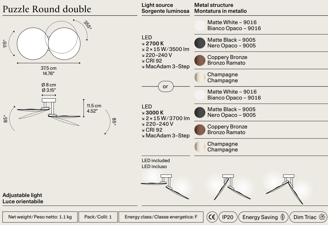 Technische Daten für "Lodes Puzzle Round double Ø19cm LED Wand- Deckenleuchte Ultra Warmweiss 2700K in Schwarz Dimmbar"