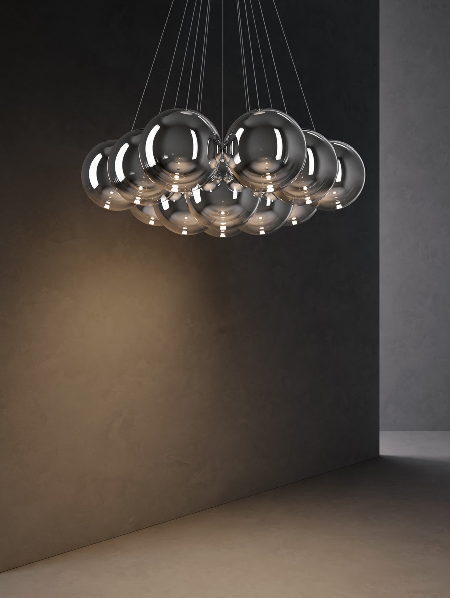 Diese Designerleuchte Random Cloud wurde von der Designerin Chia-Ying Lee entworfen und dem Hersteller Lodes in Italien hergestellt. Sie ist der moderne Kronleuchter in der heutigen Zeit. Ihre Glas Kugeln erinnern an schwebende Kosmos Elemente. Sie verschönert jedes Umfeld mit ihrem eleganten Design. Bestellbar ist die Random Cloud in verschiedenen Farben und Ausführungen. Dazu gibt es die Glas Kugeln in zwei unterschiedlichen Größen von 23 oder 28 cm vom Durchmesser. Die Glaskugeln lassen sich einzeln Höhenverstellen. Die Random Cluster eignet sich perfekt für eine Galerieaufhängung. Die Glaskugeln sind Staubdicht verschlossen. Das LED-Leuchtmittel und Glaskugeln sind einzeln austauschbar. Sei es das hellere Warme Licht von 3000 Kelvin, oder aber das etwas wärmere Warm weißen Licht von 2700 Kelvin. Die Random Cluster lässt sich Problemlos über einen Phasenanschnittsdimmer oder über einem Casambi Modul, sowie Dali Modul anstuern und dimmen. Das passende Zubehör finden Sie unten. Sollten Sie noch Fragen oder Anregungen haben, können Sie uns gerne kontaktieren. Wir helfen Ihnen gerne weiter.